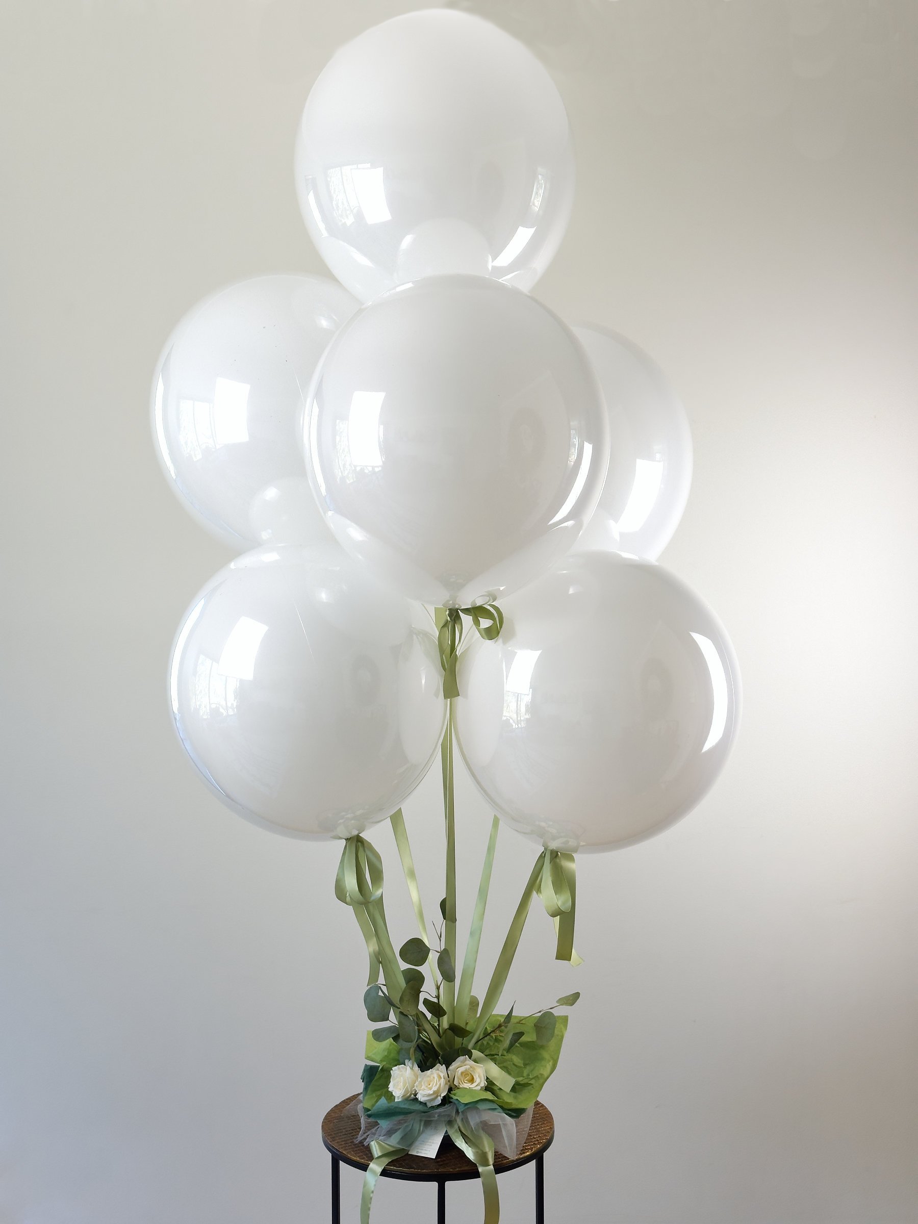 A beautiful balloon arrangement designed with understated elegance. Soft white balloons are gathered with sage ribbon, creating a fresh and refined palette. The striking base of eucalyptus and white roses is wrapped in soft green paper and finished with layers of cream tulle. Natural, romantic, and effortlessly graceful.