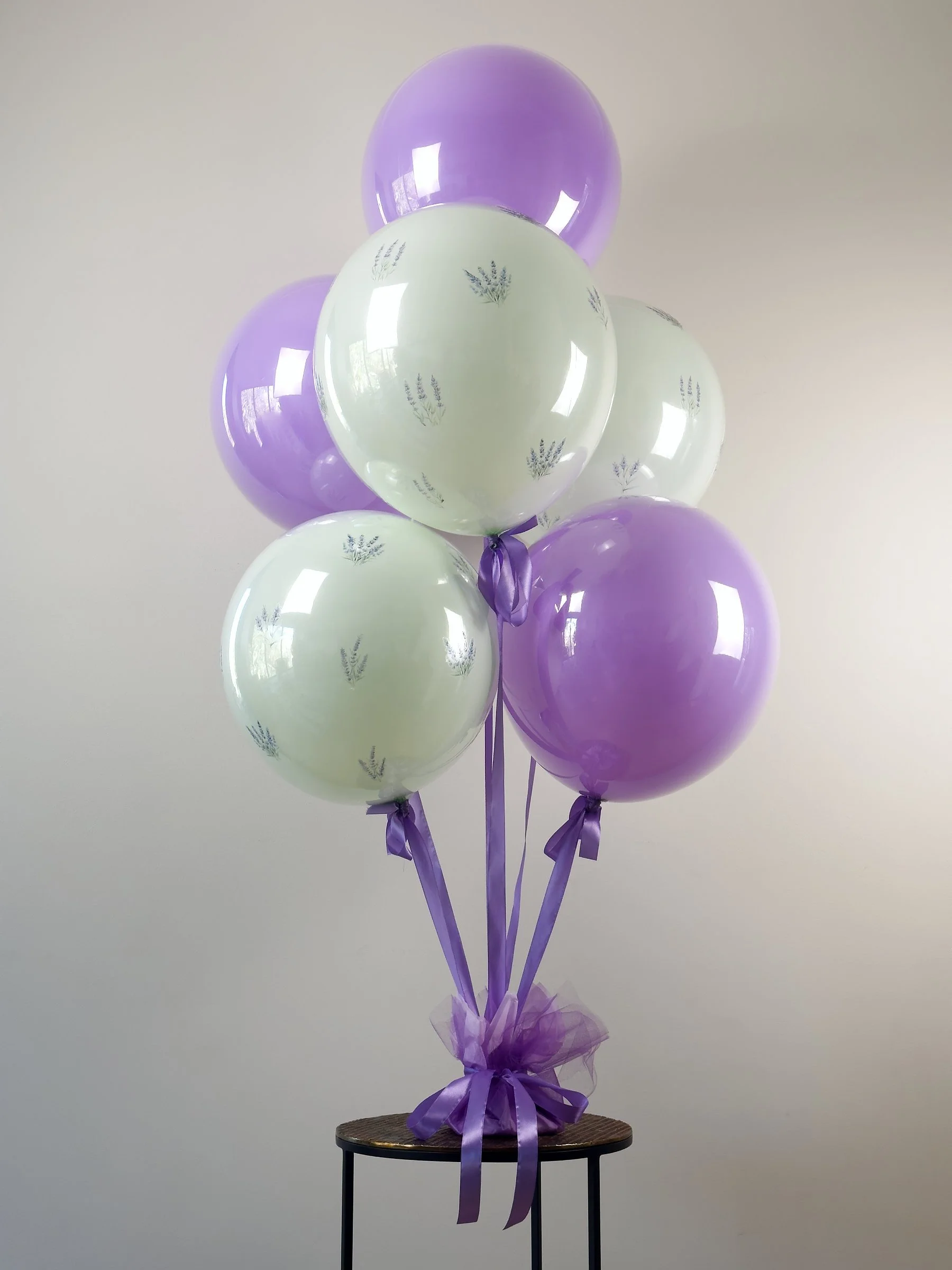 Inspired by the French countryside, La Provence is a soft and romantic bouquet with pastel green and purple balloons, adorned with lavender blossoms, and gathered together with satin ribbons.